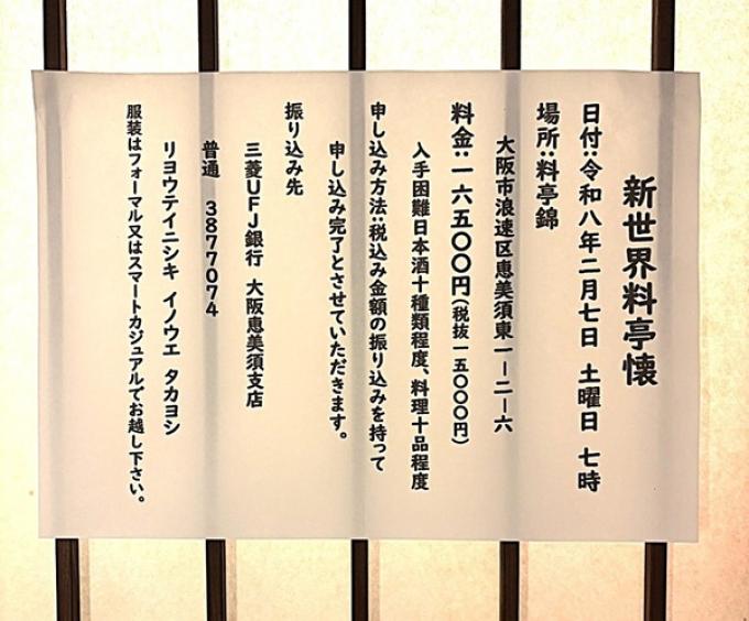 さて、令和8年2月7日(土)午後7時より、 「新世界料亭懐」を開催いたします。